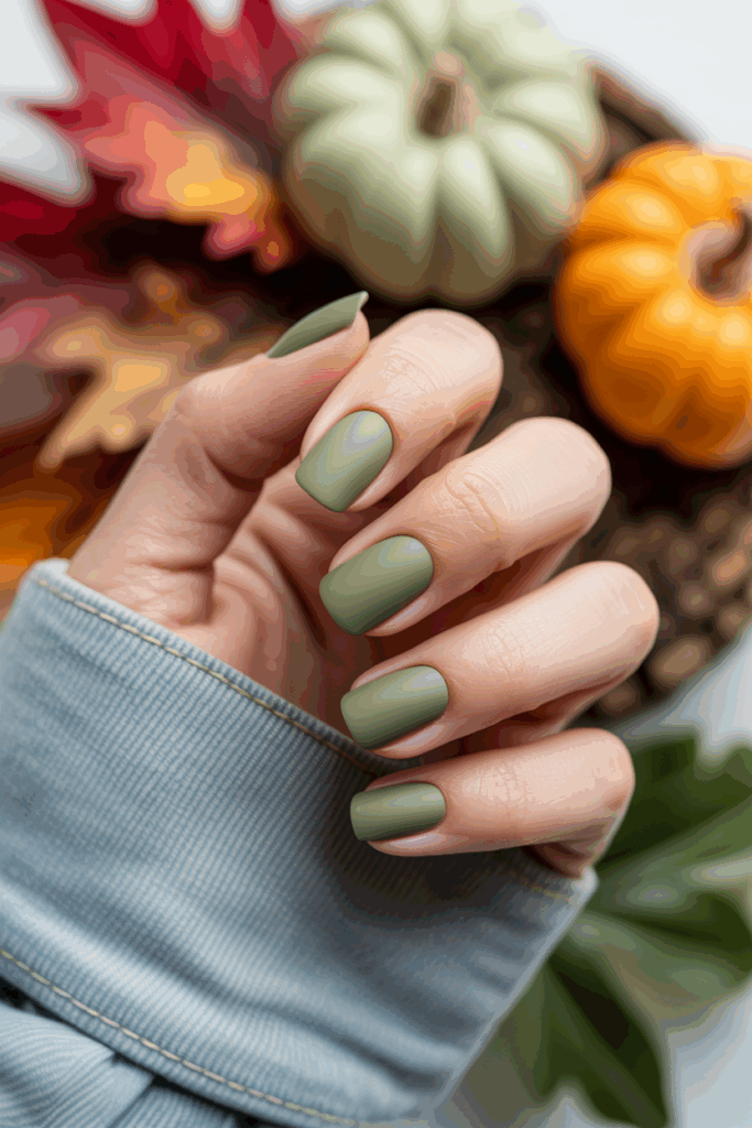 Muted olive green is a fantastic choice for fall nails. This shade brings a touch of nature right to your fingertips. It’s warm and earthy, perfectly matching the season’s vibe.