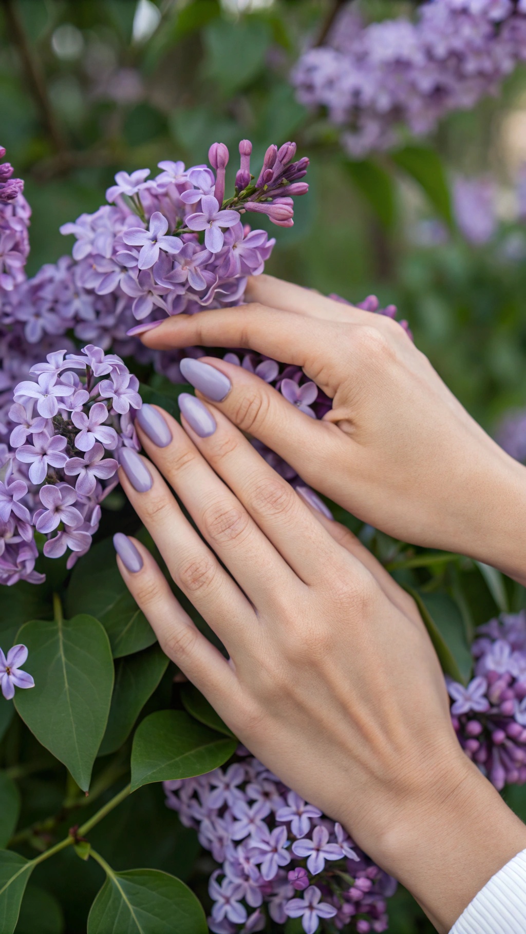 The image captures hands adorned with a beautiful dusty lavender matte polish, set against a backdrop of lilac flowers. The contrast between the nails and the blooms creates a harmonious look that feels both fresh and inviting.