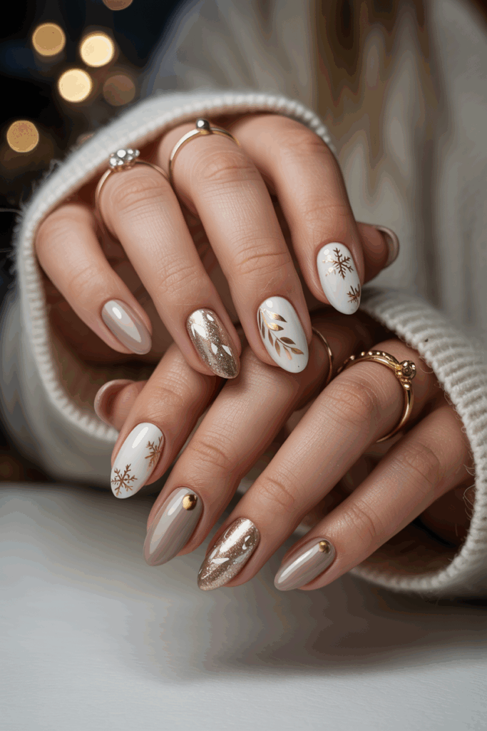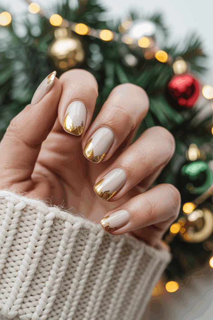 Creamy beige nails create a soft, neutral base that looks clean and elegant. Adding gold foil highlights gives the nails a chic touch without being too flashy. This style works well for holiday events or daily wear during the season. It balances simplicity and a bit of sparkle effectively.