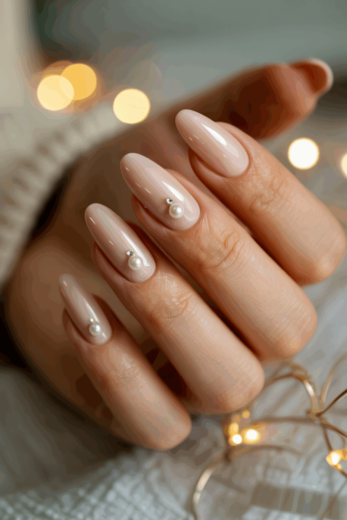 Soft ivory nails create a clean, elegant base for subtle pearl embellishments. The pearls add a delicate touch without overpowering the neutral look. This design balances simplicity with a hint of luxury, perfect for a polished holiday style.