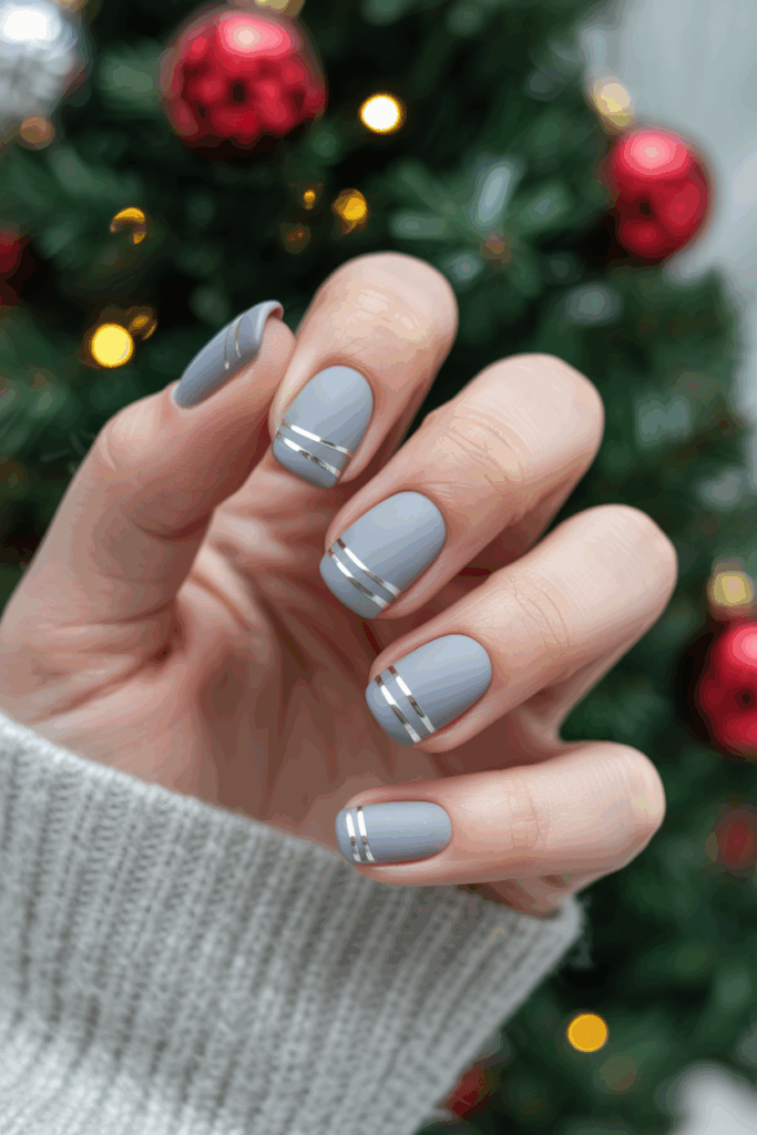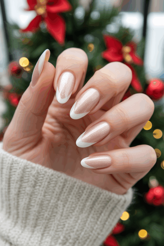 This nail design pairs soft champagne shimmer with frosty white tips. The shimmer adds a subtle shine without being too bright. Frosty white accents give the nails a cool, winter feel that fits the holiday season well. It’s a simple but elegant look.
