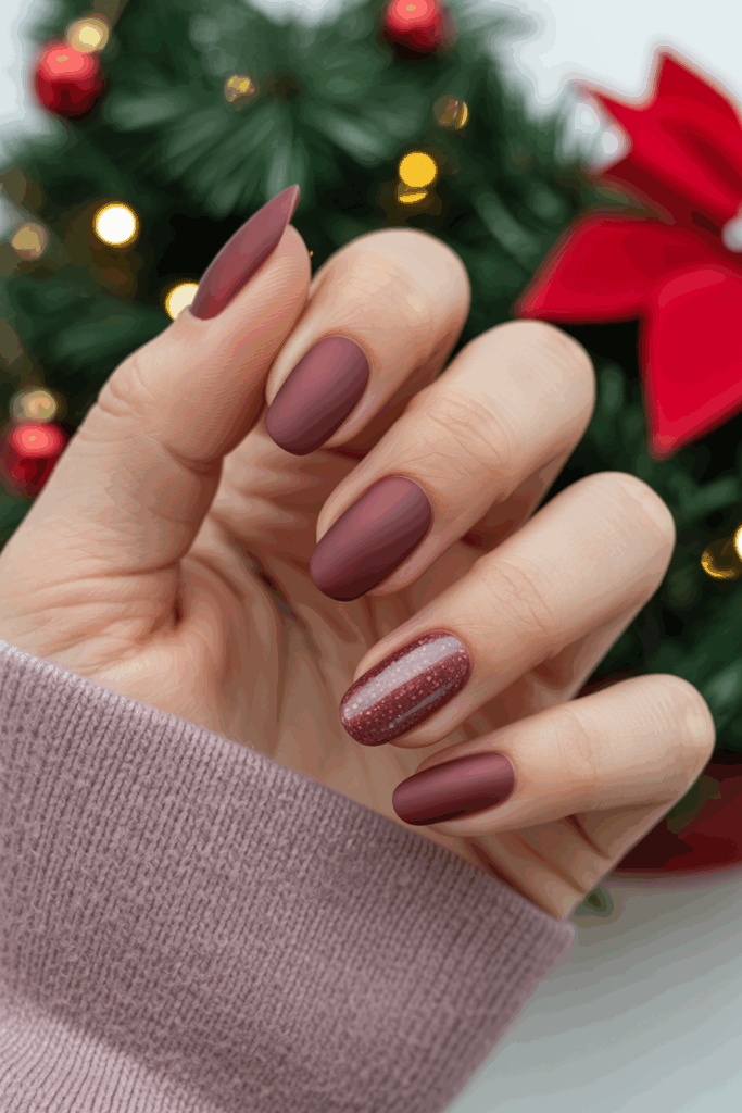 Dusty rose matte nails create a soft, muted base that feels calm and stylish. Adding a subtle sparkle gives a touch of shine without being too bright. This look combines elegance with a hint of festivity, perfect for a neutral Christmas nail design.