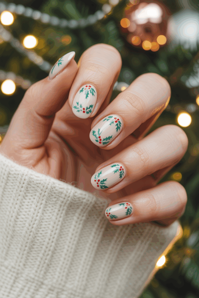 This look uses a soft cream base that keeps nails simple and elegant. Small holly details are added on a few nails for a subtle festive touch. The design stays clean and modern, perfect for those who want holiday cheer without bright colors.