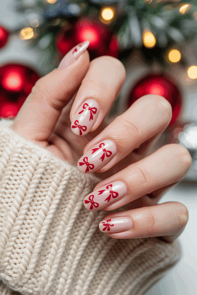 This design uses a simple nude base to keep nails looking clean and natural. Small red bow decals add a subtle festive touch without being too bright. It works well for those who want a holiday look that is elegant and understated.