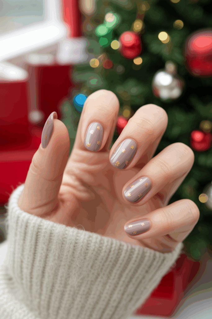 This design uses a soft pale taupe base that looks clean and simple. Small gold dots are added for a subtle shine without being too flashy. It creates an elegant, understated look suitable for holiday events or daily wear.