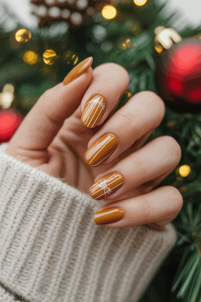This design uses warm caramel shades for a soft, natural look. Thin white lines add subtle detail and style without overwhelming the nails.