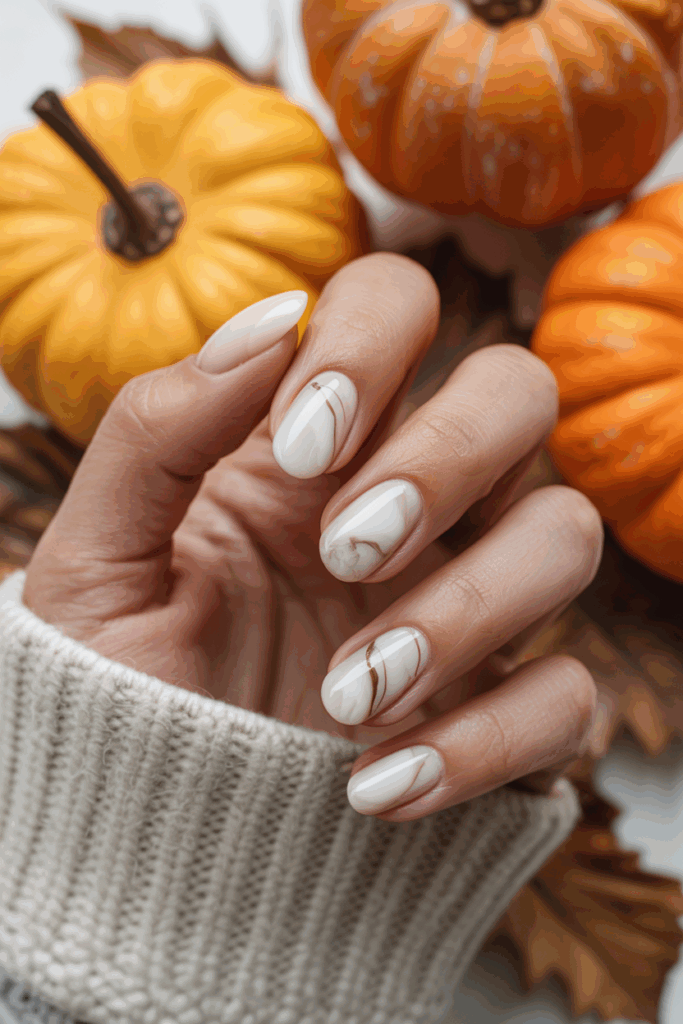 The creamy white nails with a marble effect are a stunning choice for fall. This design combines a soft, neutral base with elegant marble patterns that add a touch of sophistication. The subtle gold veins running through the marble create a beautiful contrast against the white, making the nails look chic and polished.