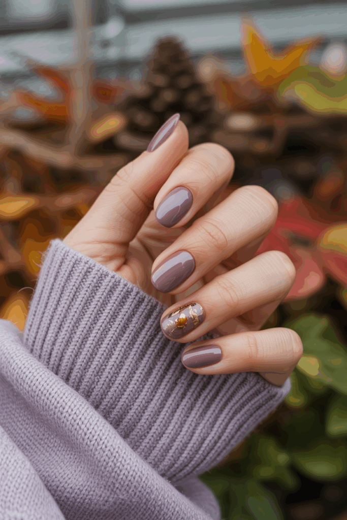 In the image, the nails are beautifully manicured, showcasing a mix of matte mauve and sparkling gold. The surrounding autumn leaves enhance the seasonal vibe, making this design a great choice for fall gatherings or casual outings. Pairing this nail look with cozy sweaters or warm scarves will complete the autumn aesthetic.