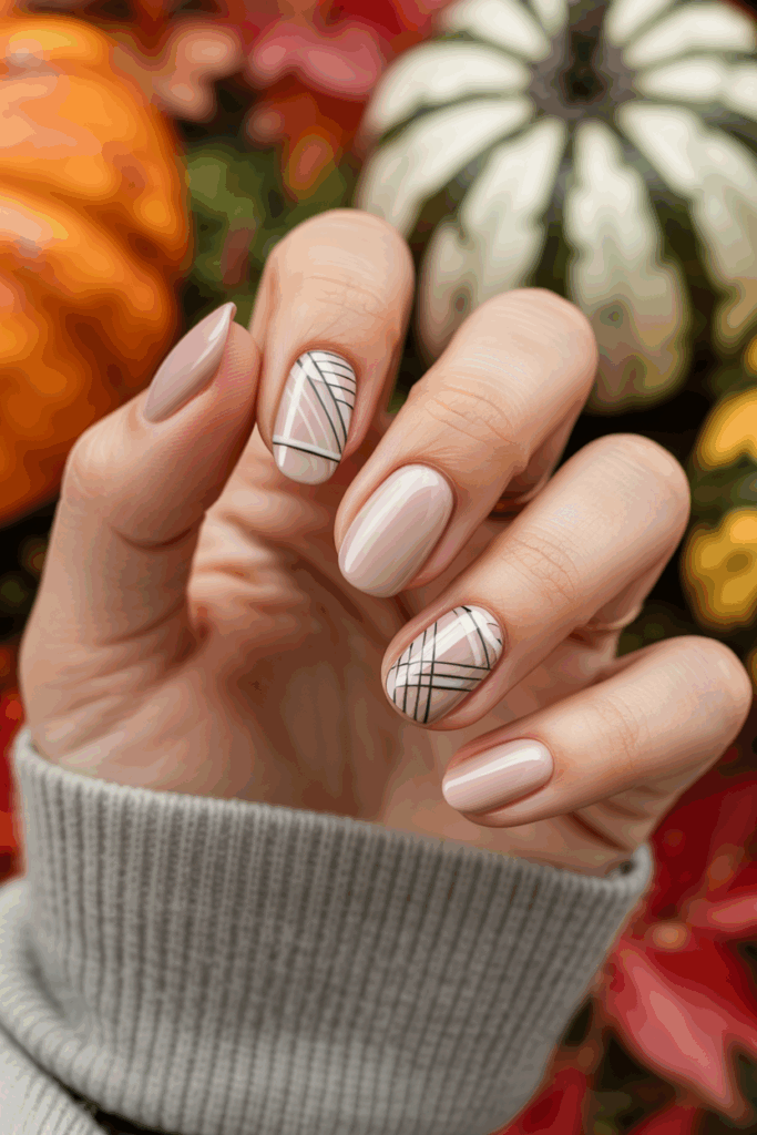 Sandy beige nails are a fantastic choice for fall, offering a warm and inviting look. The soft, neutral tone complements the changing season beautifully. This style features a mix of solid sandy beige and a few accent nails adorned with thin black lines, creating a chic contrast.