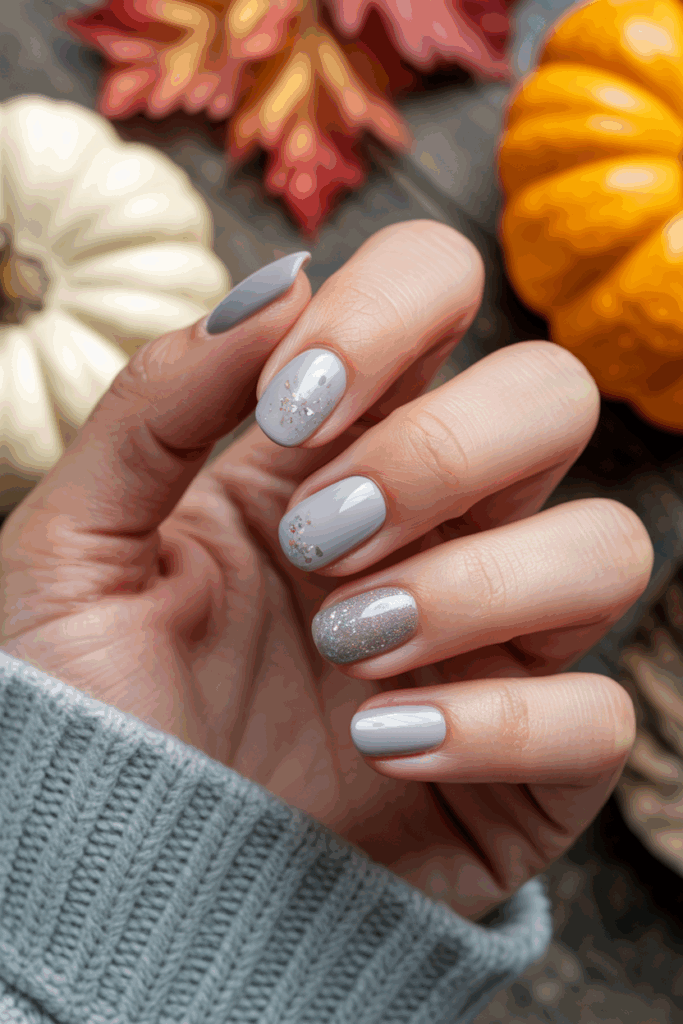Pale gray nails with a hint of glitter are a perfect choice for fall. This design combines a soft, neutral tone with a touch of sparkle, making it both chic and understated.