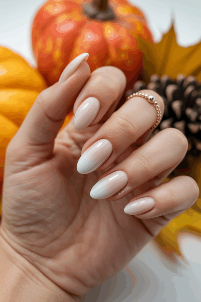 The soft, creamy color adds a cozy vibe that pairs beautifully with fall outfits. Whether you’re wearing a chunky sweater or a light scarf, these nails will complement your style effortlessly. The shine on the nails enhances their appeal, making them look polished and well-cared-for.