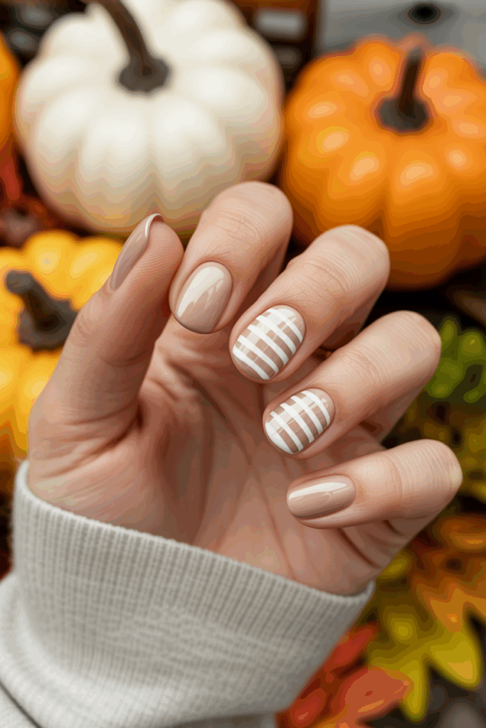 Warm sand and white stripes create a lovely contrast that feels fresh and inviting. This nail design features a soft beige base, reminiscent of sandy beaches, paired with crisp white stripes. The combination is perfect for fall, adding a touch of warmth while keeping things chic.
