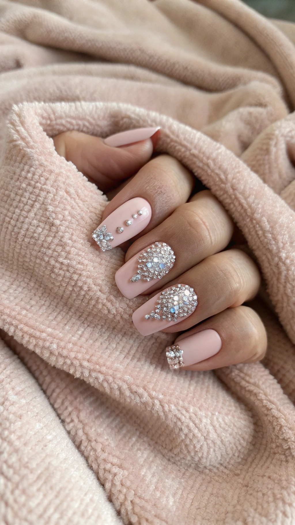 The addition of rhinestones elevates the look, adding a touch of sparkle and glam. You can see various sizes and shapes of rhinestones arranged creatively on some nails, making them stand out. This playful mix of textures gives the nails a unique flair.