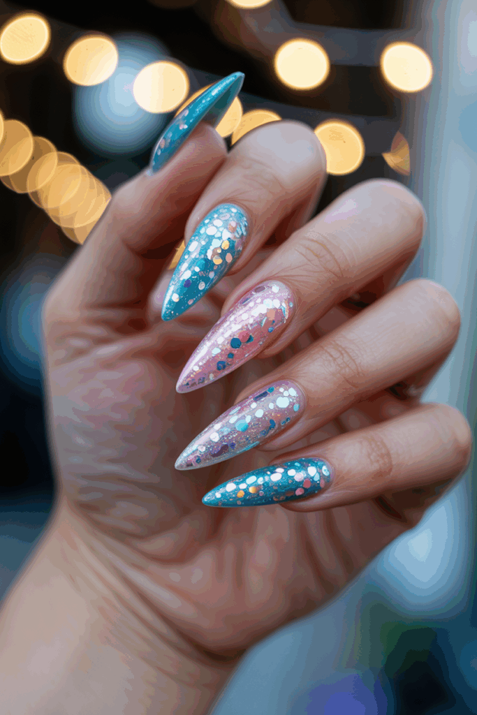 They create a fun and lively look by mixing small glitter pieces in different colors. This style adds texture and shine without being too bold.