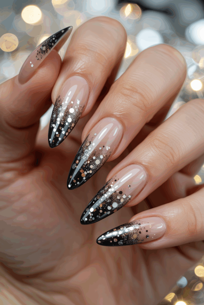 This dazzling nail design combines sophistication and sparkle for a look that’s perfect for fall evenings or festive events. A soft nude base gradually fades into deep black tips, creating an elegant ombre effect that feels both modern and timeless. What truly elevates this design are the shimmering gold and silver flecks scattered across the gradient — they catch the light beautifully, adding dimension and glamour without overpowering the natural tone beneath.