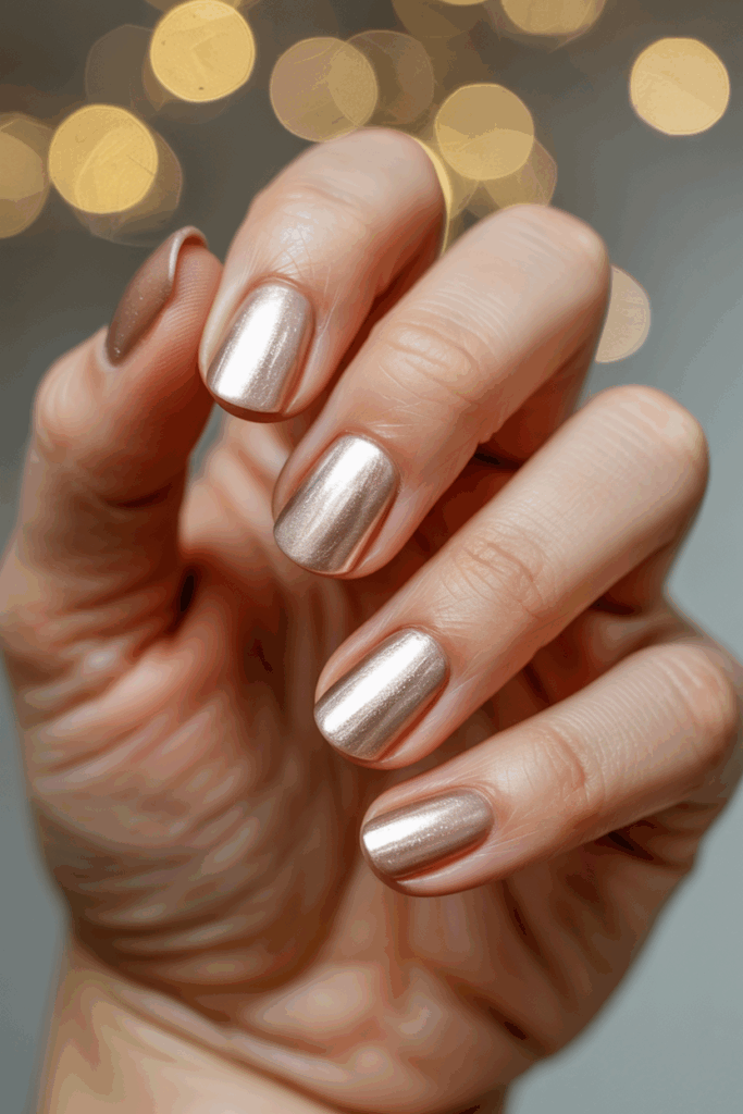 Champagne-inspired metallic nails offer a soft, elegant shine. The color is usually a light gold with subtle sparkle, giving a clean and chic look.