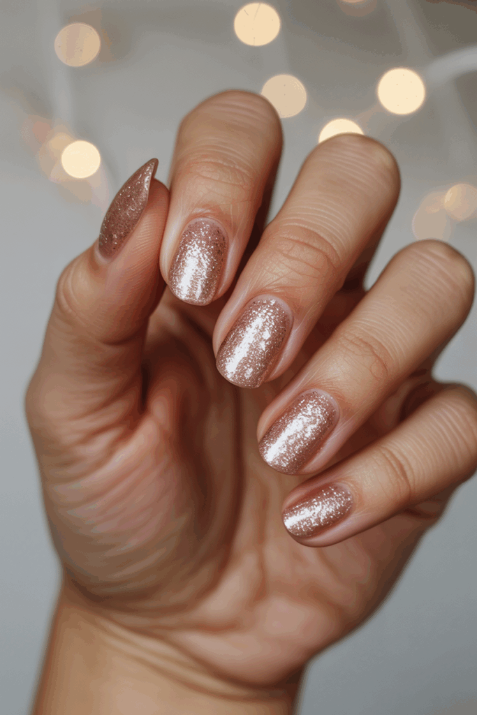 A full-glitter manicure in rose gold offers a timeless and elegant look. It combines sparkle with a warm metallic tone that suits any celebration. This style is simple yet eye-catching, perfect for New Year’s Eve. It adds shine without needing extra designs or accents.