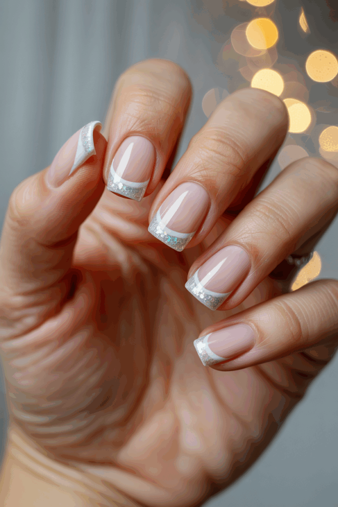 The sparkly white tips work well with almond or oval-shaped nails. They keep the style clean but add a hint of celebration.