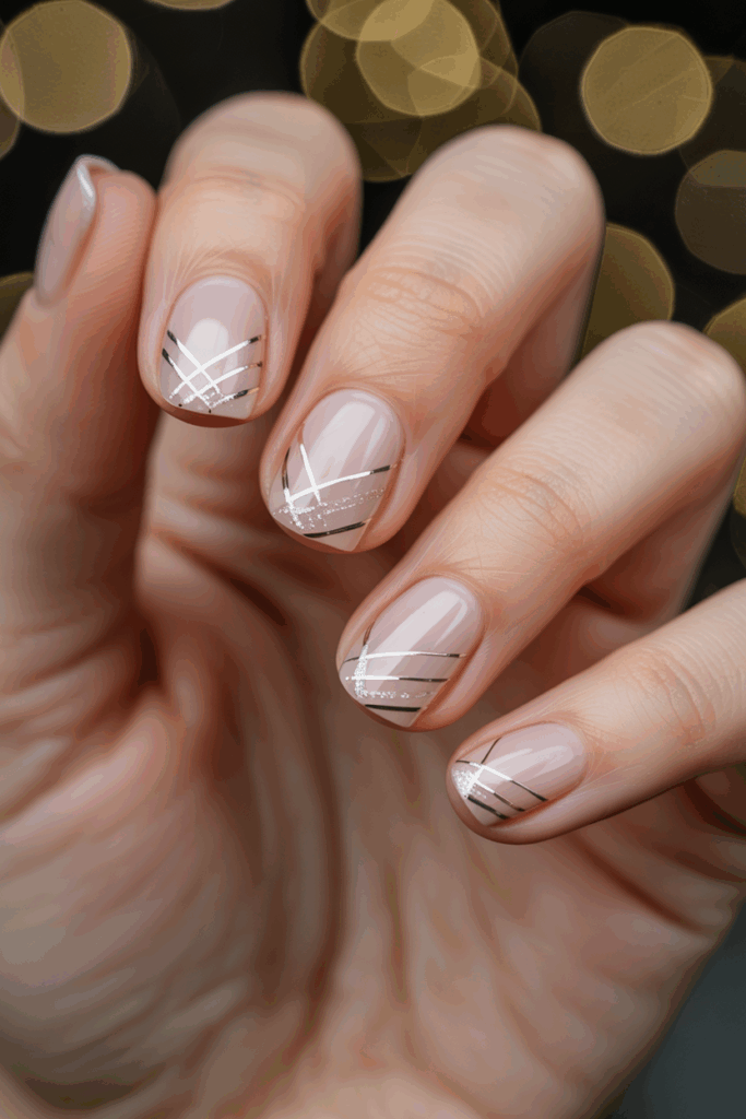 This design uses clean, geometric lines with a touch of sparkle over a nude base. It creates a modern and subtle look. The sparkling lines add just enough shine for New Year’s Eve without being too bold. It suits those who prefer a minimalist style with a festive edge.