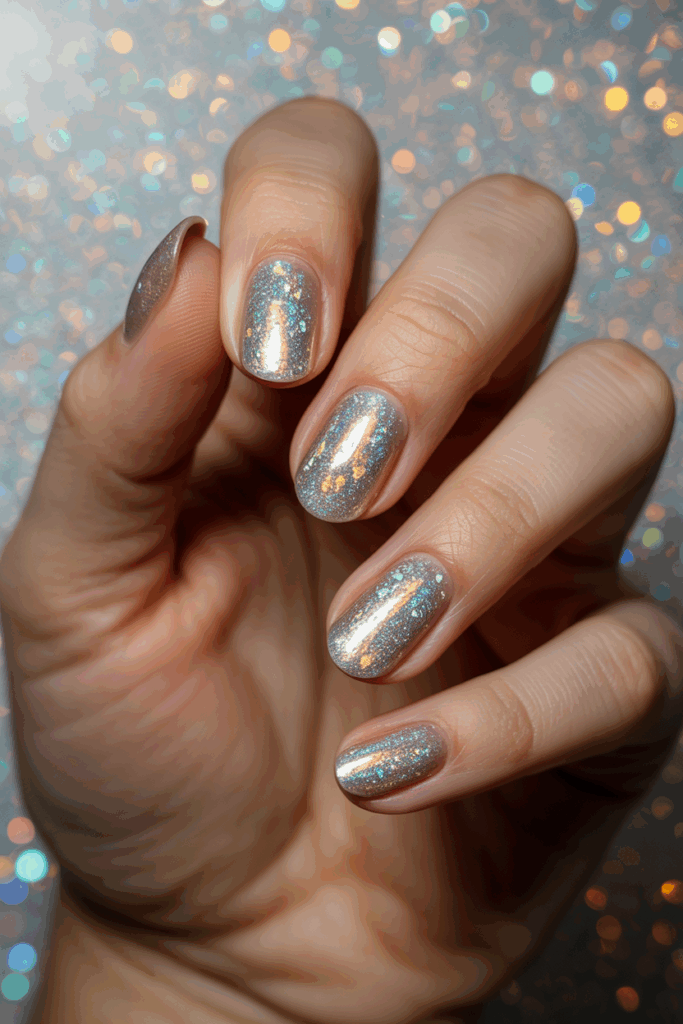Holographic glitter nails create a shiny, rainbow-like effect that changes with the light. They offer a modern and eye-catching look without being too bold. This style works well for New Year’s Eve parties that call for a bit of sparkle and elegance.