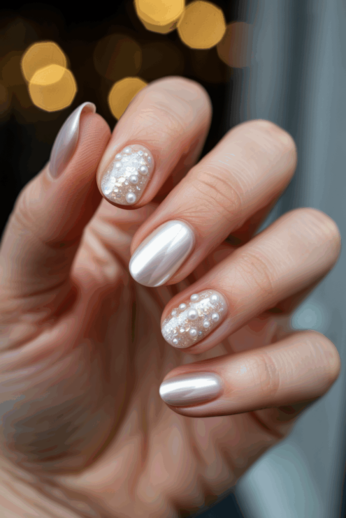 Pearl and glitter nails combine smooth shine with sparkling texture. This look balances elegance with fun. The pearls add a soft glow while the glitter brings festive sparkle. It works well for those who want a stylish but not overwhelming design.