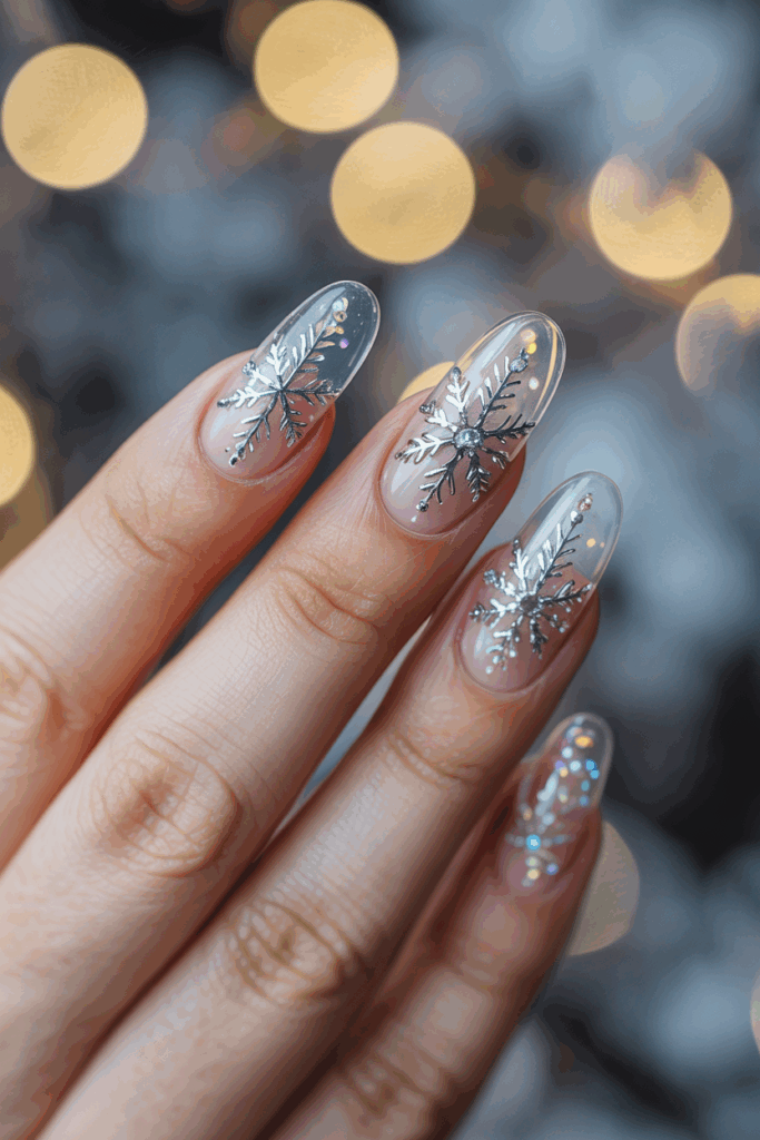 Sparkly snowflake designs on a clear base create a fresh, winter look. The clear background highlights delicate white or silver snowflakes with glitter accents. This style is subtle but festive, perfect for those who want sparkle without heavy color. It fits well with any outfit for New Year’s Eve.