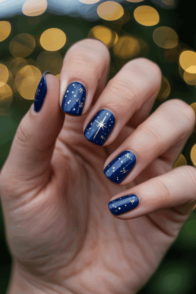 Midnight blue nails offer a deep, rich base that suits New Year’s Eve perfectly. The silver glitter scattered on top creates a look like stars shining in the night sky. This design adds a simple but elegant sparkle without being too flashy. It pairs well with many outfits and styles.