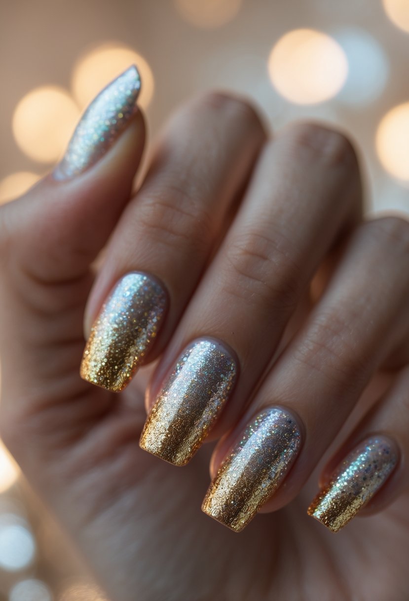 Glitter gradient nails blend silver and gold tones for a smooth sparkle effect. The colors fade into each other, creating a stylish and eye-catching look.