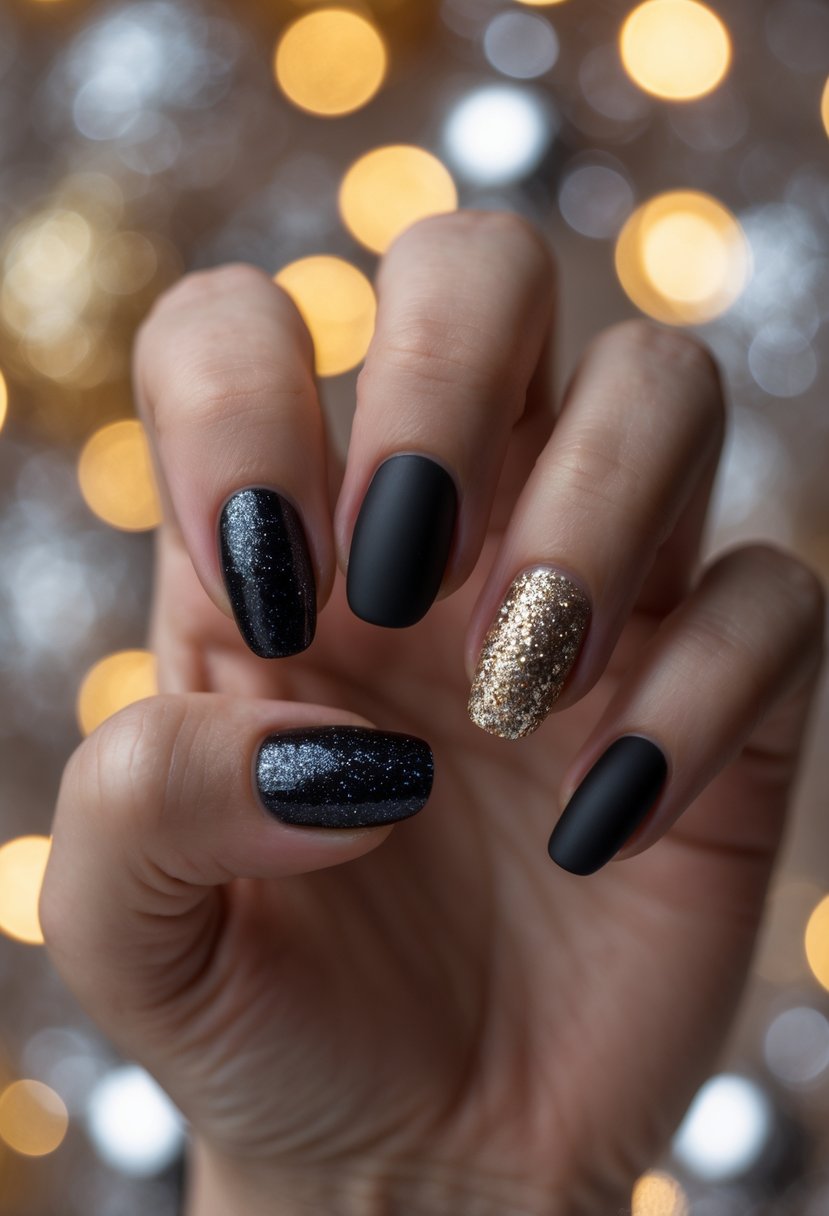 Matte black nails create a bold, sleek look. Adding a sparkly accent nail brings a touch of shine without losing the edgy feel. This style works well for New Year’s Eve, balancing elegance and sparkle in a simple design. Many choose silver or glitter for the accent.