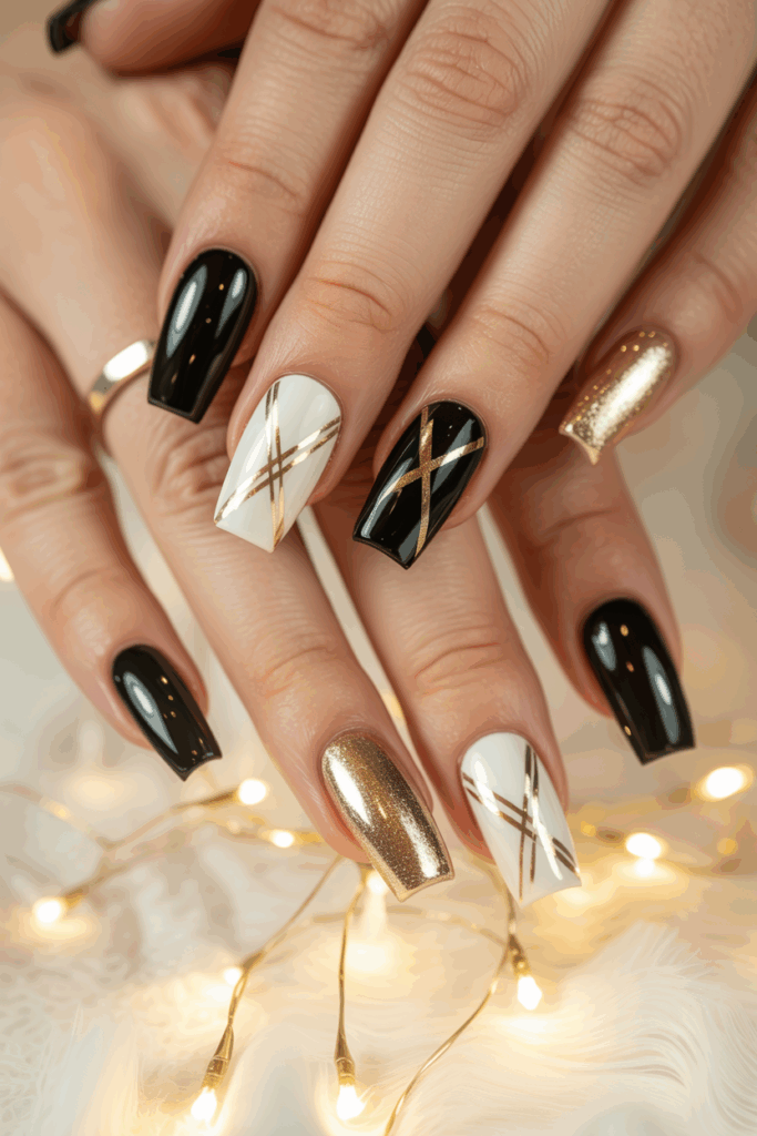These designs can include lines, triangles, or abstract shapes. They add a subtle but stylish edge to New Year’s nails.