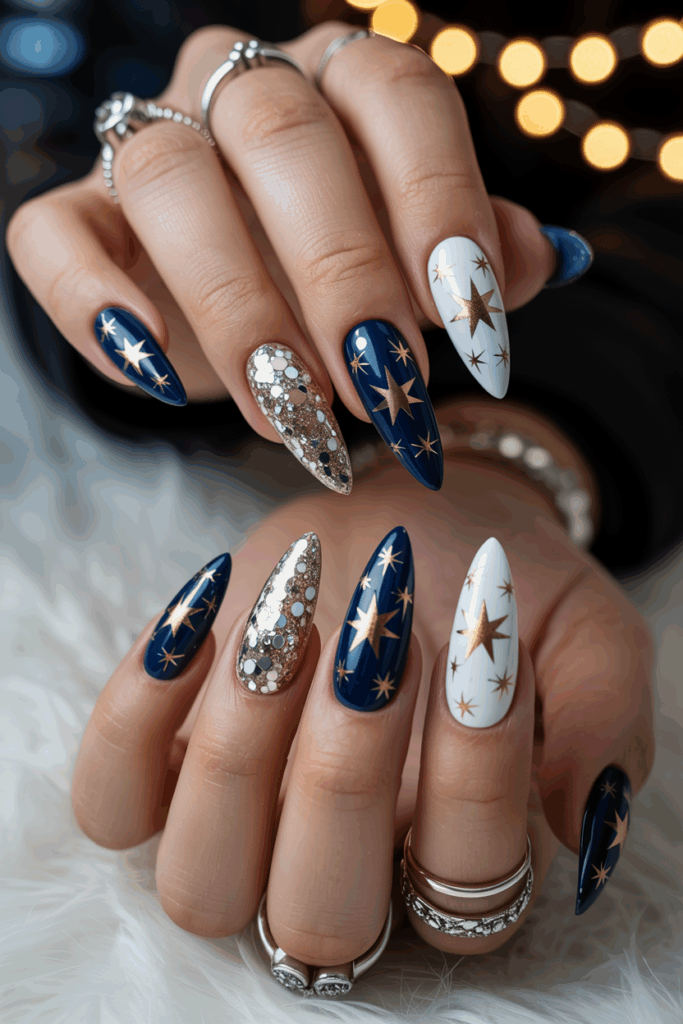 Sparkly star designs add a festive touch to New Year’s nails. They often feature small star shapes with glitter or metallic polish. These designs create a subtle but elegant look suitable for any celebration.