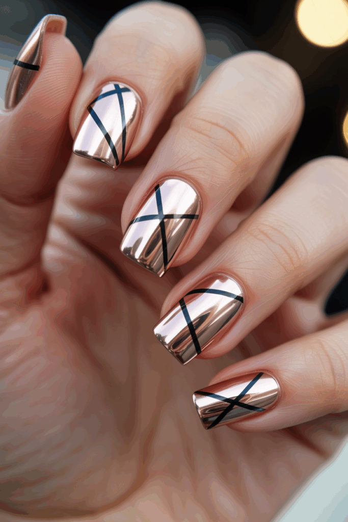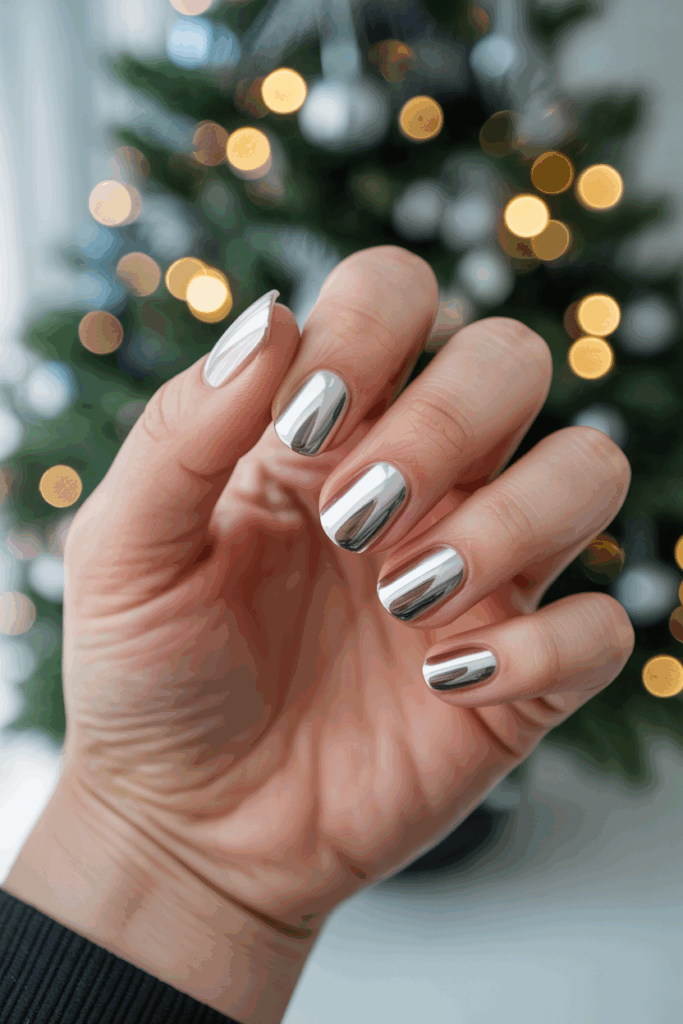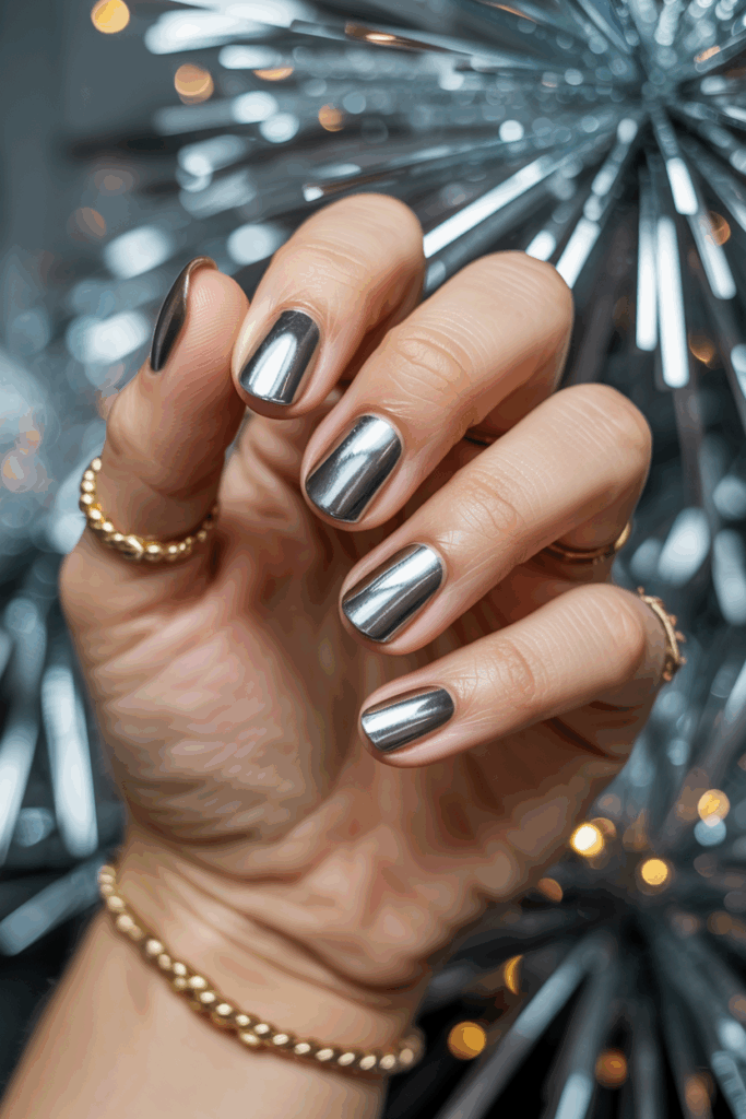 Metallic chrome nails offer a shiny, mirror-like finish that fits well with New Year’s celebrations. They come in silver, gold, rose gold, and other colors.