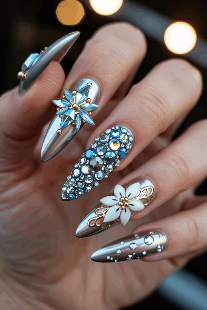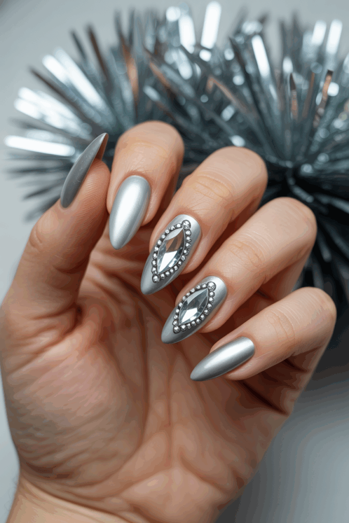 Silver nails with glitter add a cool, shiny base for New Year’s looks. Small gemstones on one or two nails create a sharp contrast that stands out. This style offers a simple way to bring sparkle without being too flashy. It fits well with winter celebrations.