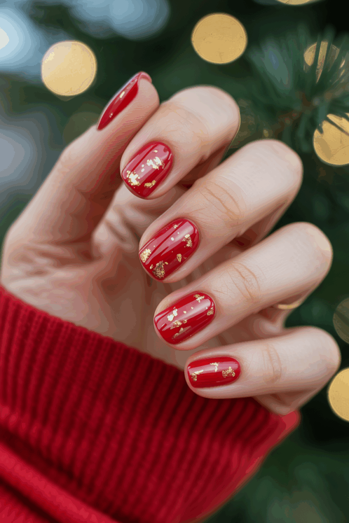 This design combines a rich red base with delicate gold flakes. It offers a simple yet elegant look. The gold flakes add a subtle shine that works well for New Year’s celebrations or any special event.