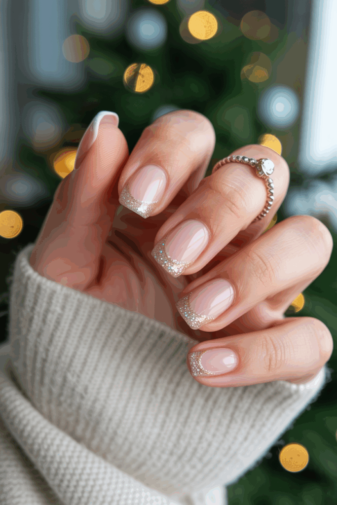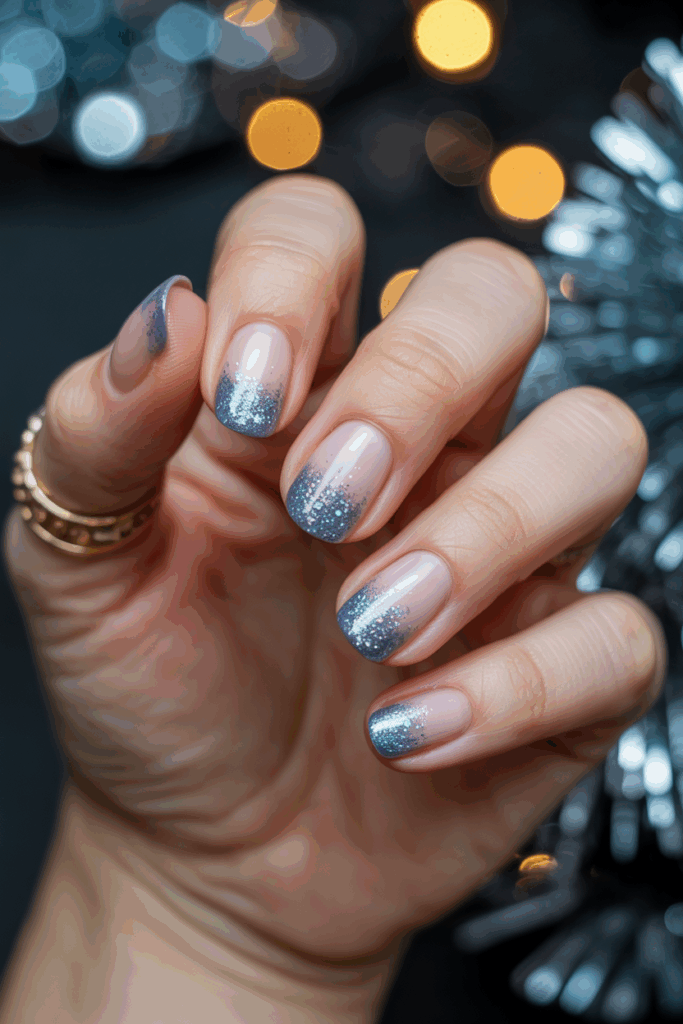 This nail design blends glitter smoothly into a base color. It gives a soft fade effect that looks festive without being too bold.