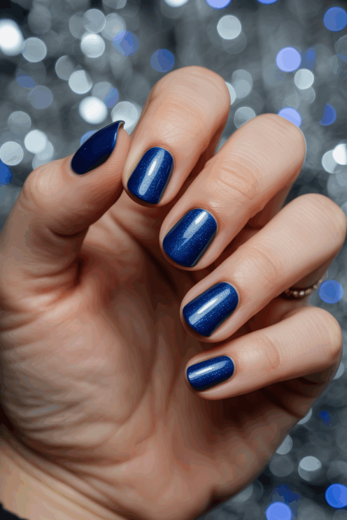 Glittery midnight blue nails offer a deep, rich color with sparkling accents. The dark base highlights the glitter, creating a subtle but eye-catching effect. This design suits festive occasions like New Year’s Eve or anytime a touch of elegance is desired.