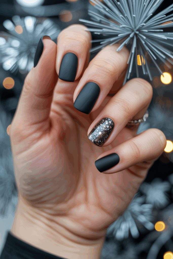 Matte black nails offer a smooth, velvety finish that looks modern and sleek. Adding glitter to this matte base creates a striking contrast. This combo blends edgy style with a touch of sparkle, perfect for New Year’s celebrations. It suits both simple and bold nail designs.