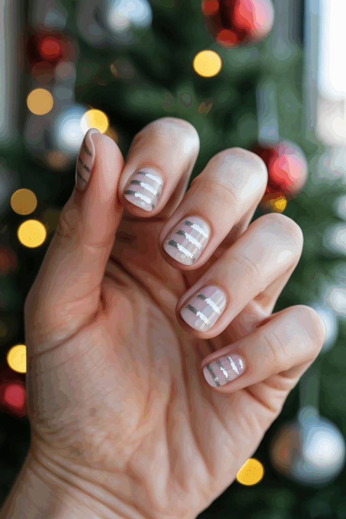Minimalist glitter stripes add a simple sparkle to nails without being too flashy. Thin metallic or glitter lines give a clean, elegant look. This style works well on all nail lengths and fits both short and long nails. It’s a subtle way to celebrate with a touch of shine.