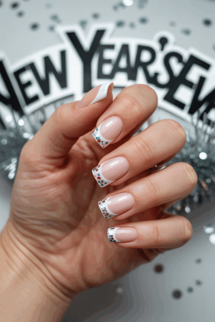 The confetti tip manicure adds a festive touch to classic nails. It features small, colorful specks concentrated at the tips. This style works well with clear or neutral bases, offering a subtle but fun look for New Year’s celebrations.