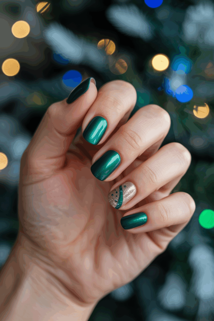Metallic green accents add a modern touch to New Year’s nail designs. They work well on one or two nails to create a stylish contrast.