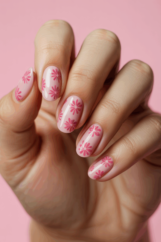 Floral pink nail art combines soft pink shades with delicate flower designs. It works well on different nail shapes and lengths.