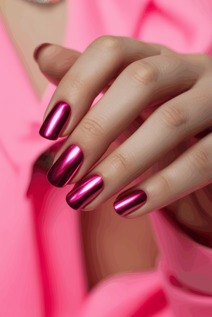 Hot pink chrome nails offer a bright, shiny look that stands out. The chrome finish adds a metallic shine, making nails appear smooth and reflective. This style works well for both bold and simple designs. It is easy to pair with different nail shapes and accessories.