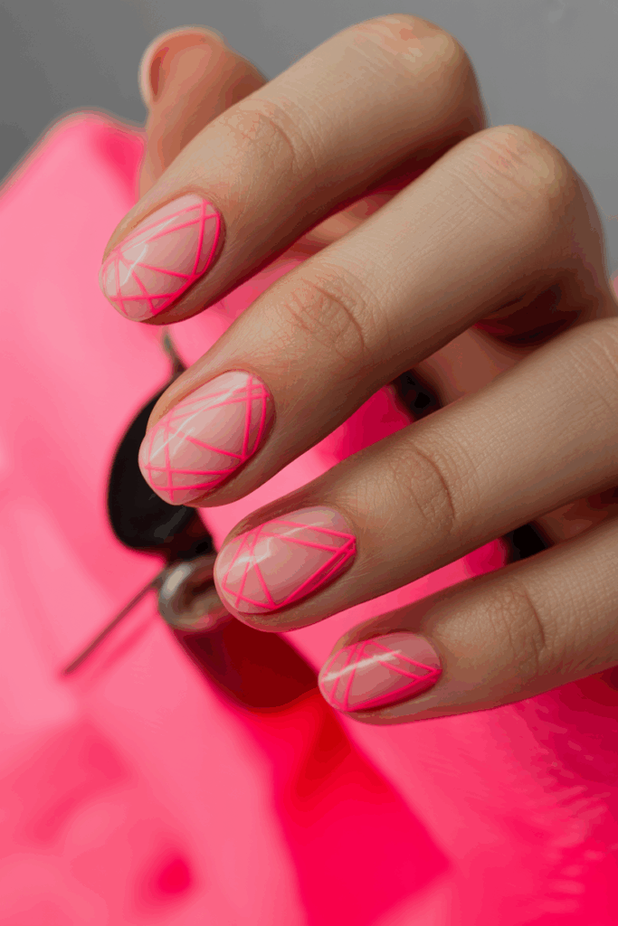 Neon pink combined with geometric shapes creates a sharp, modern look. Using black or white lines with triangles, stripes, or squares adds contrast. This design fits people who want a bold but stylish manicure.