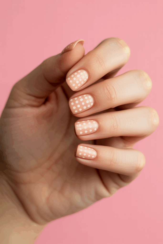 This look uses a soft peachy pink base for a clean and subtle appearance. Small dots in a slightly lighter or darker shade add simple detail without overwhelming the nails. It suits those who want a gentle pop of style while keeping things minimalist and neat.