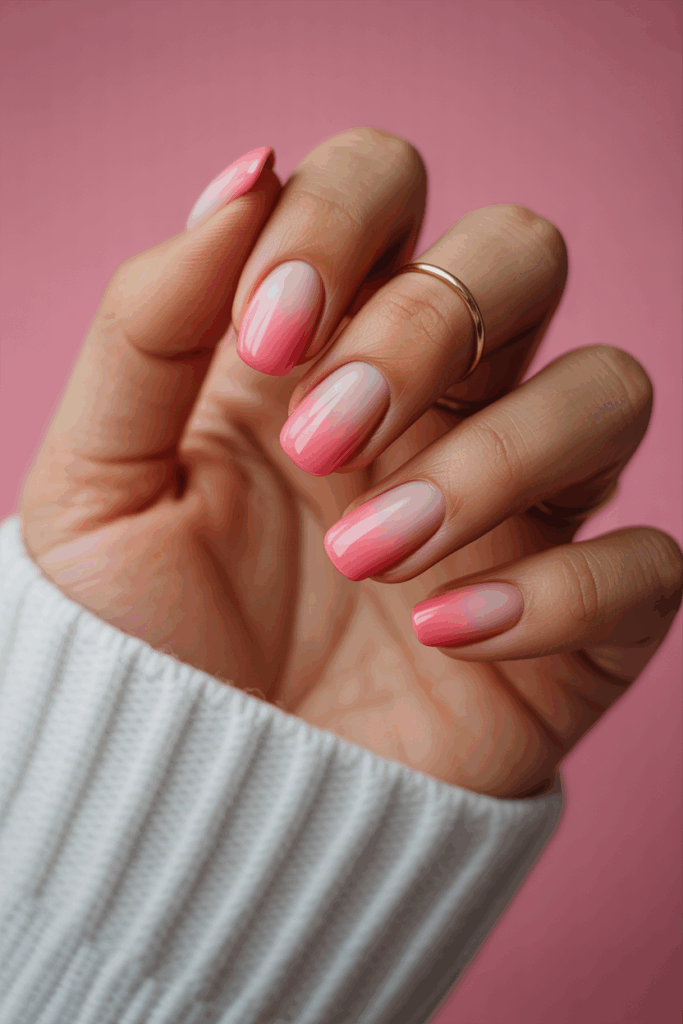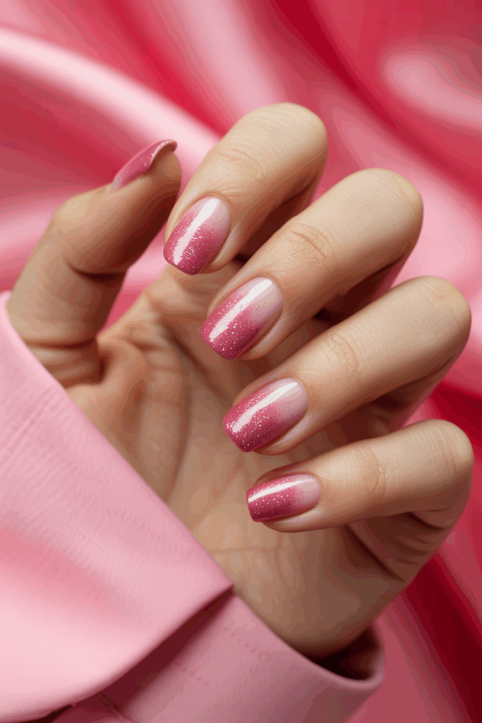 The pink glitter gradient blends soft pink shades with sparkling glitter. It creates a smooth transition from a natural tone to a glittery finish.