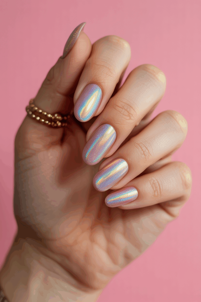 Pink holographic nails reflect light to show a rainbow of colors. The holographic particles add a shiny, multi-dimensional effect.