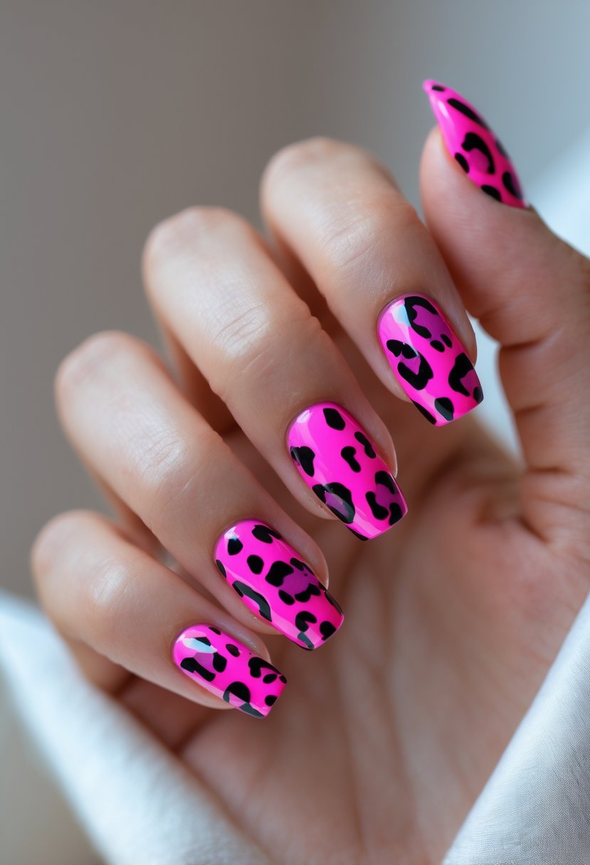 Bright pink animal print nails mix bold colors with wild patterns. They often use leopard or zebra designs in black or metallic on a bright pink base. This style offers a fun and edgy look without being too overwhelming.