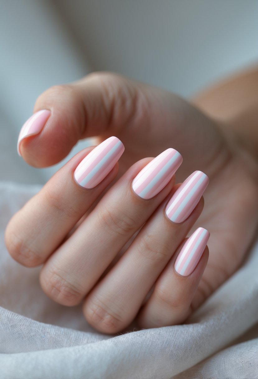 Pink and white striped nails offer a clean and modern look. The stripes can be thin or thick, adding variety to the design. This style works well for both casual and formal occasions. It creates a fresh and simple manicure that remains stylish.