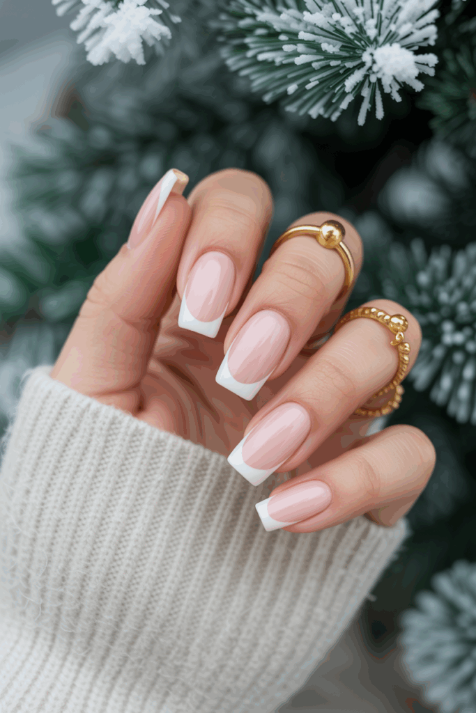 This design features a soft pale pink base paired with clean white French tips. It offers a timeless, elegant look ideal for winter. The simplicity makes it suitable for both casual and formal occasions. This style stays fresh and neat throughout the season.