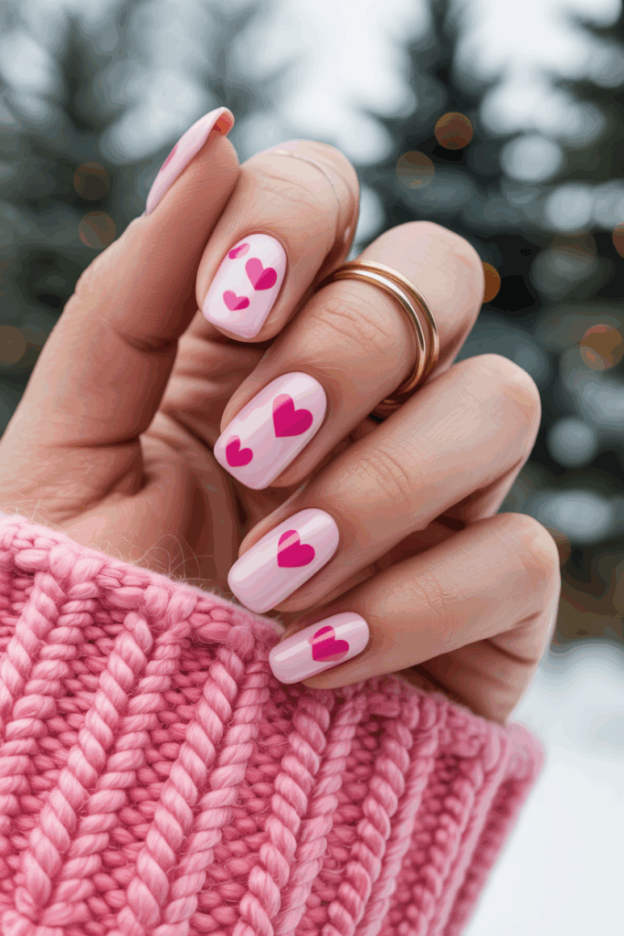 This design blends soft cotton candy pink with small heart shapes. The hearts add a gentle, romantic touch without being too bold. It works well for those who want a sweet but simple winter look. The colors stay light, making the nails feel fresh and charming.